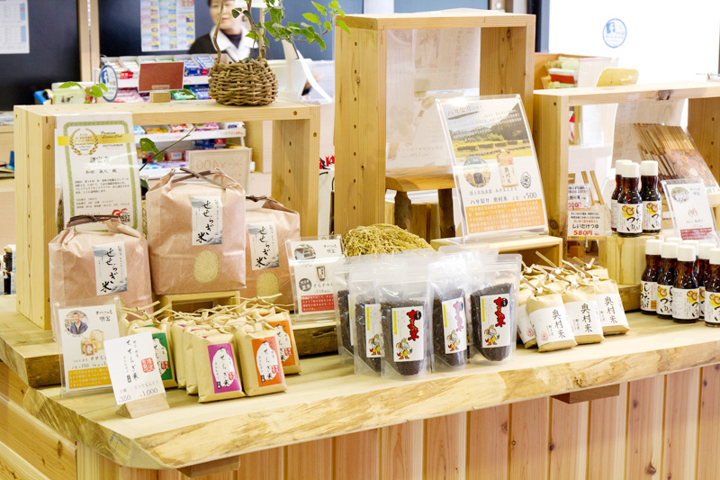 おみやげ、特産品コーナーには、「手づくりの里、めいほう」と銘打った地元特産品が並びます。保冷コーナーには、明宝ハムをはじめ、ジェラート、醤油、味噌、塩など、さまざまな味付けの鶏ちゃんなど人気商品が揃っています。
